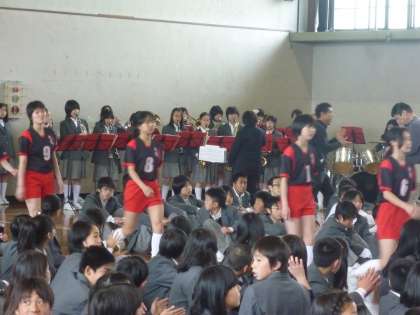 今日の4時間目に春季総合体育大会 激励会を行いました。まず、吹奏楽部の行進曲演奏の中、ユニフォームに身を包んだ各クラブの選手たちが入場しました。