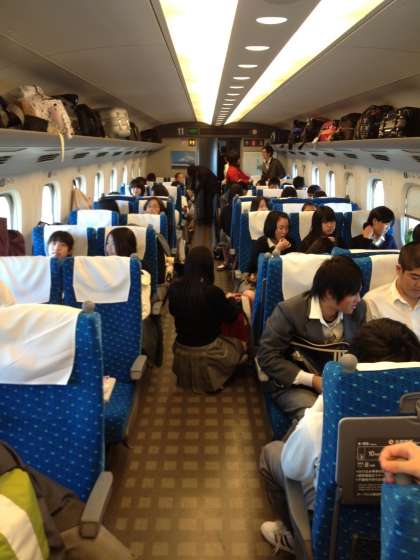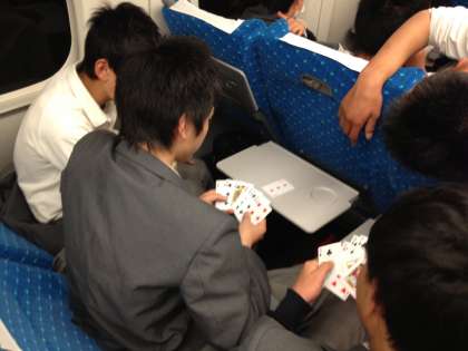 新幹線「のぞみ99号」は、九州に向かって快走中。岡山を過ぎました。車内では、友人とおしゃべりしたり、トランプをしたりとくつろいでいます。