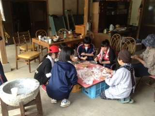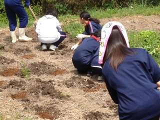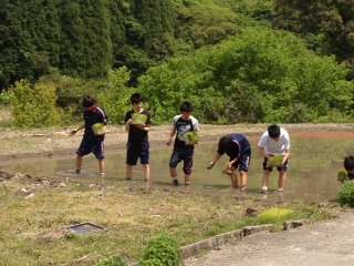 安心院での農業体験が始まりました。田植えをするグループ、野菜の世話をするグループなど様々です。たいへん良い天気なようで、強い日射しの下で活動しています。地元の方との話もはずんでいるようです。