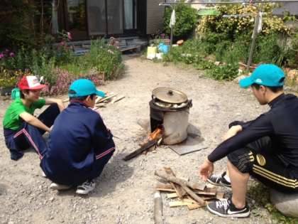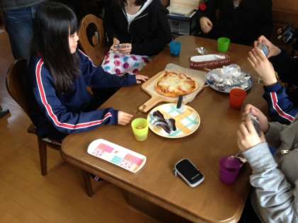 引き続き、安心院での農業体験の様子です。男子のグループは、何かを煮ています。何ができるのでしょうか?女子のグループは、昼食にピザを焼いてもらったようです。みんないい表情をしています。
