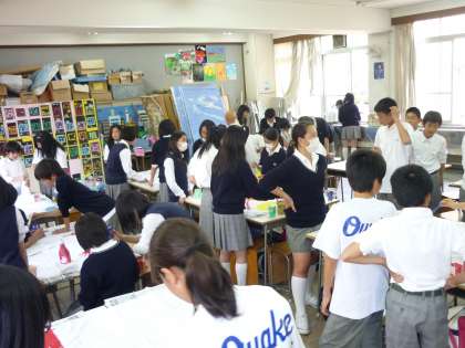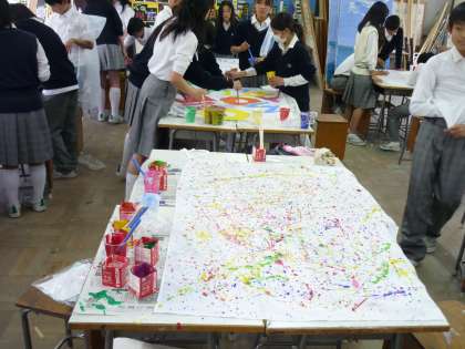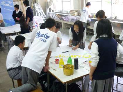 1・2年生は、放課後に学級旗を制作しています。学級の代表が、体操服に着替えて美術室に集まって下絵から色塗りへとすすめています。