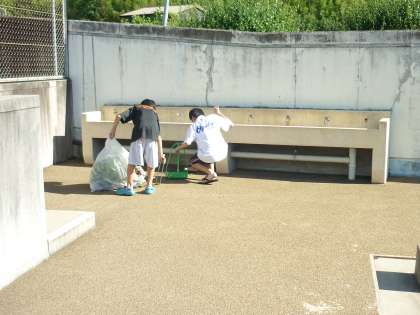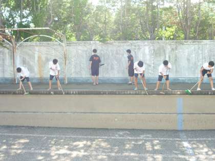 放課後、バスケットボール部男子とバレーボール部の生徒に手伝ってもらってプール清掃を行いました。今日は、プールサイドのゴミを取ったり、プールサイドに張り出している樹木を剪定しました。大粒の汗を流して、頑張ってくれました。感謝!感謝!