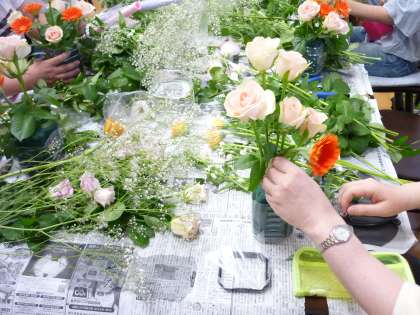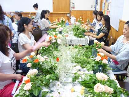 今日の午前中にPTA文化委員会主催の文化教室が開かれました。テーマは、「生け花とお抹茶の体験教室」。講師の先生にお越しいただいて、まず生け花の体験です。見栄えよく生けるのは、見た目よりむつかしいようで、参加された皆さんは和気あいあいの雰囲気の中にも真剣な表情で取り組まれていました。