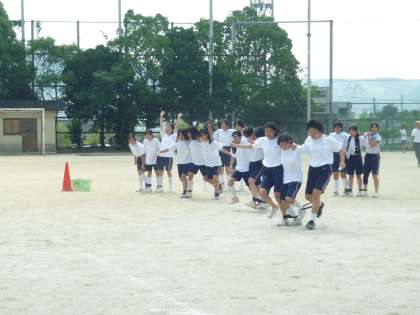 写真は、上から 男子3人4脚リレー 女子3人4脚リレー クラス対抗全員リレー