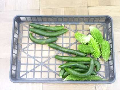 校内の学校菜園で育てている「きゅうり」が順調に生育し、収穫できました。立派な「きゅうり」でおいしそうです。また、緑のカーテンの「ゴーヤ」も収穫できました。ゴーヤチャンプルにすると最高でしょう。