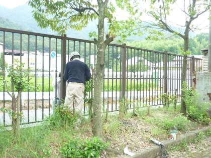 東門両側の柵が所々で破損していました。見栄えが悪く、防犯上も危険がありました。そこで教育委員会にお願いしたところ、補修をしてもらえることになりました。今週の月曜日から業者の方に作業してもらっています。