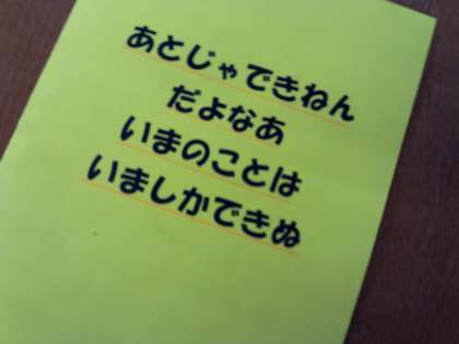 朝,教室を回っていると,あるクラスの合唱コンクールの楽譜の表紙に,写真のように「あとじゃできねんだよなあ いまのことはいましかできぬ」と書かれていた。机に置かれていたのは一部だけゆえに,外がどうかはわかない。