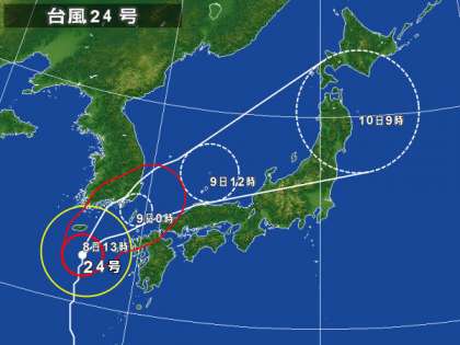 台風24号が北上を続けています。近畿地方には、明日9日(水)昼ごろに最接近するとの予報が出ています。先月16日の台風18号に伴い、「特別警報」が発令され、大雨によって大きな被害が出たことは記憶に新しいです。台風情報に注意して、「突風」や「大雨」にじゅうぶん気をつけてください。なお、台風接近に伴う臨時休業などの非常措置については、右下の「配布文書」の欄にのせてありますので参考にしてください。また、生徒手帳のP35にものせてありますので確認してください。