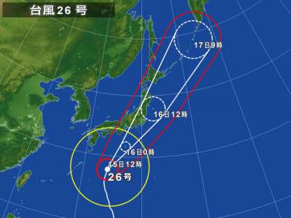 台風26号が北上を続けています。近畿地方には、明日16日(水)未明から明け方ごろに最接近するとの予報が出ています。今後の台風情報に注意して、「突風」や「大雨」にじゅうぶん気をつけてください。なお、台風接近に伴う臨時休業などの非常措置については、右下の「配布文書」の欄にのせてありますので参考にしてください。また、生徒手帳のP35にものせてありますので確認してください。