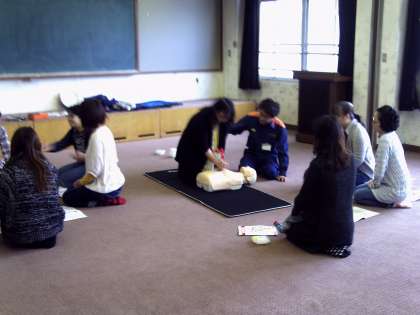 9日の土曜日,PTA主催で救急救命講習会が開かれた。私たち教職員も夏にやったばかりである。山科消防署から講師を迎え,お母さん方も懸命に講習に取り組んでおられた。