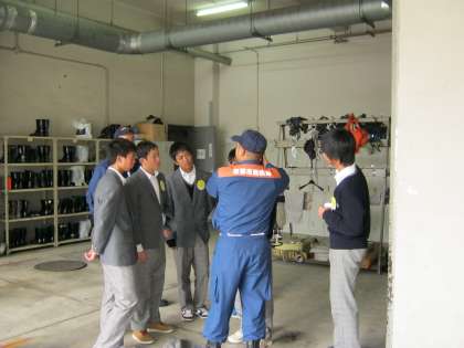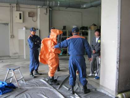 ※写真は、山科消防署での体験の様子です。消防服を着させてもらっています。