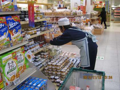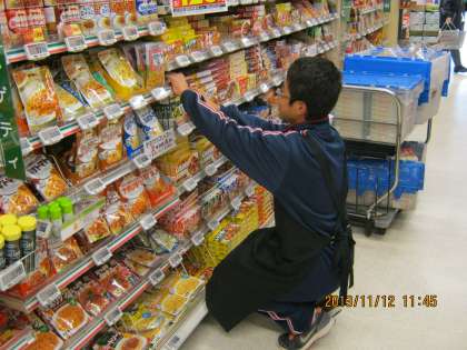 保育園での体験の様子とスーパーマーケットでの体験の様子です。スーパーマーケットでは、どうすればお客さんに気持ちよく買い物してもらえるか考えながら商品を並べています。