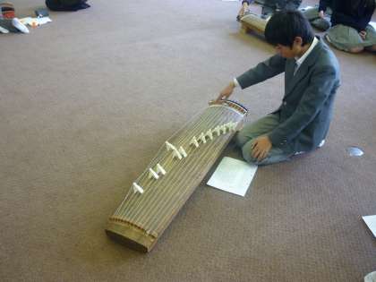2年生の音楽の授業は、十三弦の琴を練習しています。「さくら」という曲を弦を弾きながら演奏しています。グループで交代しながら練習をして、グループ内で聴き比べをします。琴の音色が教室に響いて、心地よく感じました。