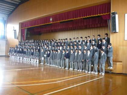 1年生は、5時間目に来週12日(水)に行われる「3年生を送る会」に向けて合唱の全体練習をしました。体育館内に美しいハーモニーが響いていました。当日が楽しみです。1年生は、先週にインフルエンザによる学年閉鎖で練習時間が十分とれていませんが、遅れを取り戻そうと懸命です。