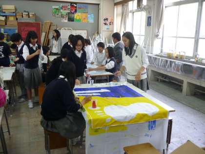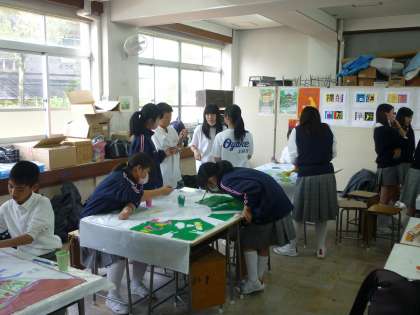 1・2年生の学級旗制作が進んでいます。ほとんどのクラスが色づけ作業をしています。完成間近です。