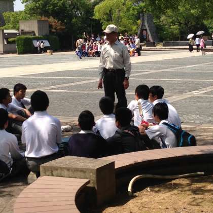 語り部さんと碑めぐりをしている様子です。語り部さんが熱心に話されることを熱心に聞いています。原爆投下のあの日から69年が過ぎようとしています。多くの方々の犠牲の上に今の平和があることをかみしめてほしいです。