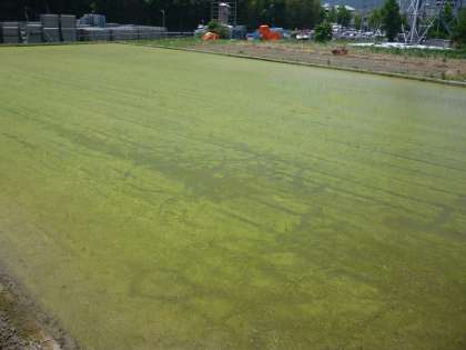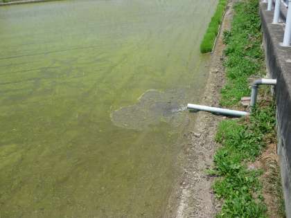 校門前の水田では、田植えが終わりました。今年も豊作を願っています。