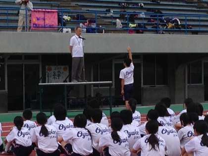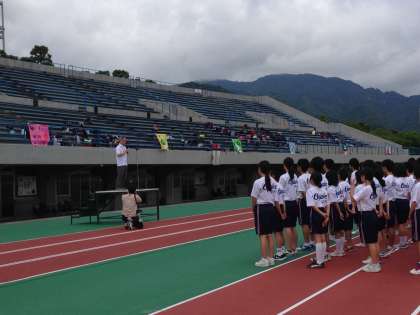 皇子山陸上競技場に無事、到着し開会式が行われています。昨年は、実施できませんでしたので、1年生はもちろん、2年生も初めての陸上競技記録会です。自己記録更新を目指して練習の成果を発揮してください。少し遠方ですが、保護者の皆様の応援もお待ちしています。