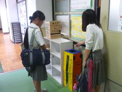 生徒会の活動のひとつにペットボトルキャップの回収があります。キャップを回収してワクチンと交換して、伝染病(ポリオ)に苦しむ世界各地の子どもたちを救おうとする活動です。今日も回収ボックスにキャップを入れる生徒の姿がありました。一人一人の気持ちを一つにすると大きな力になります。全校生徒の協力を願っています。