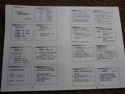進路説明会は、進路主事から公立高校と私立高校の入試日程や入試の概要などを説明しました。公立高校の入試制度が変更になって、2年目を迎えます。普通科が単独選抜になり高校ごとに合否判定がされます。各高校の特色や求める生徒像を見極めて、目的意識をしっかり持って進路選択をしてください。