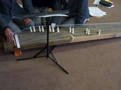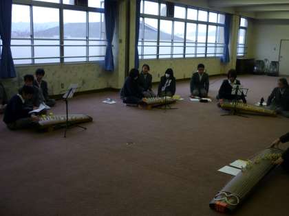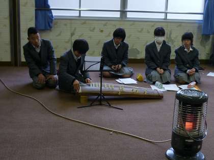 2年生の音楽は、琴の練習をしています。日本伝統の琴ですが、生徒はうまく演奏しています。曲目は「さくらさくら」です。グループで教えあいながら和気あいあいの雰囲気です。