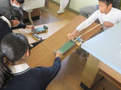 3年生の理科の授業で、等速直線運動と斜面を下る台車の運動の実験を行いました。台車を走らせ、記録をとります。そして、記録をまとめていきます。生徒は、真剣な表情で取り組んでいました。
