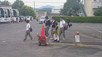 午前中の活動も終わりに近づき、民泊先から退村式の会場に続々と到着しています。これから退村式です。名残惜しいですが、お世話になった民泊先の方ともお別れです。