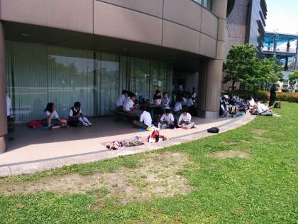 2年生は、校外学習に出かけています。午前中は、立命館大学の平和ミュージアム見学と立命館大学の学校見学をしました。立命館大学で昼食休憩の後、京都市内3か所(清水寺周辺・南禅寺周辺・京都駅前)で外国人へのインタビュー活動をします。練習の成果を活かして、成功することを願っています。写真は、立命館大学構内での昼食時の様子です。