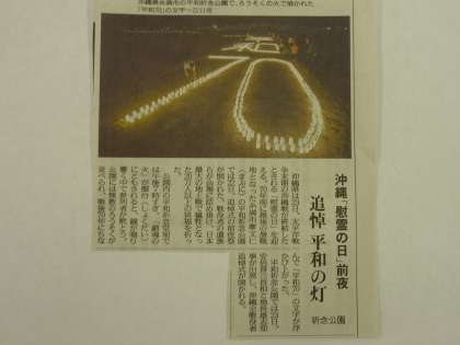今日、6月23日は「沖縄慰霊の日」です。今から70年前の1945年6月23日、太平洋戦争で唯一地上戦が行われた沖縄で組織的な戦闘が終結しました。犠牲者は20万人以上とされ、「慰霊の日」の昨夜、最後の激戦地となった南部の摩文仁にある平和祈念公園では無数のろうそくで「平和の灯」が灯されました。平和の大切さを考える1日にしたいものです。
