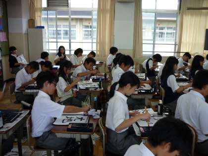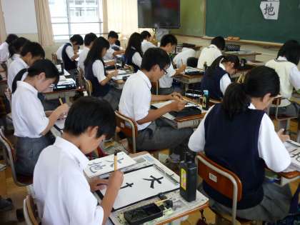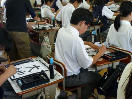 1年生の国語は、書写の授業です。生徒たちは、普段あまり使わない筆と墨で「大地」という文字を書いています。鉛筆に比べて、「止め」や「はらい」がむずかしく、懸命に練習しています。清書を1枚提出しますが、うまく仕上げてください。