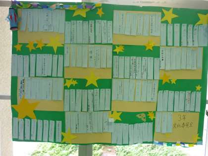 文化委員会が昇降口に掲示物を作ってくれました。七夕にちなんで、全校生徒の願い事を一覧にしています。今日から始まる三者懇談で来校された時にぜひご覧ください。