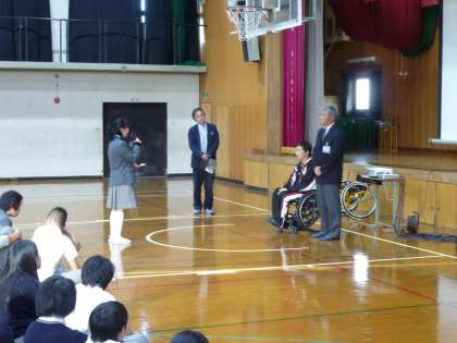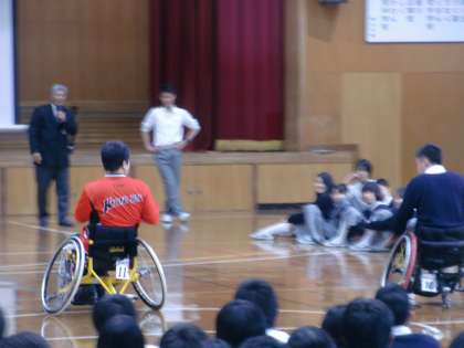 5・6時間目に体育館で人権学習を行いました。今回の人権学習は車いすバスケットをテーマにして、京都市教育委員会 坂野晴男参与と選手の山本英嗣さんをお迎えして、お話をしていただき、実技を見せてもらいました。