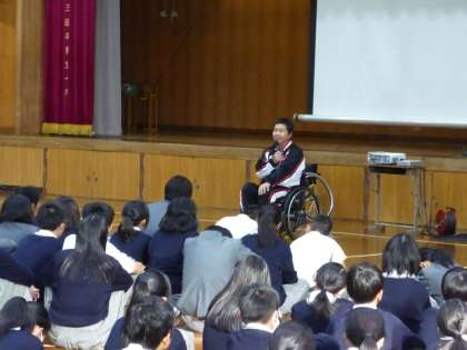 最後に、生徒たちにお願いとして、道路にゴミを捨てたり、ガムやつばを吐いたりしないでほしいと話されました。車いすに乗っていると車輪をつたってゴミやガム、つばが手につくことがあり、気分が悪くなるとのことです。バリアフリーが最近よく言われますが、「もの」のバリアフリーだけではなく「心」のバリアフリーもあわせて必要だと山本さんのお話を聞いて感じました。