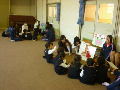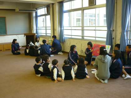 今日もかわいいお客さんが来校されました。大宅保育園の年中組の皆さんです。3年生の生徒と楽しいひと時を過ごしてくれました。3年生の生徒は、童心にもどり笑顔が絶えませんでした。3回にわたって来校してもらった大宅保育園の園児の皆さん、ありがとうございました。