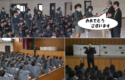 4月20日(木)に全校集会を行いました。落ち着いた雰囲気できちんと話が聴けていました。まず伝達表彰を行いました。そして,4月からの様子のお話や,通級指導教室についてのお話,また「あいさつ」についてのお話がありました。生徒会からは,各委員長や生徒会長から連絡がありました。まとまりのある雰囲気の中での全校集会でした。