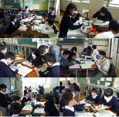 校外学習に向けて,調べ学習を行っています。タブレットを使って調べたり,班で話し合ったりして,楽しそうにしていました。