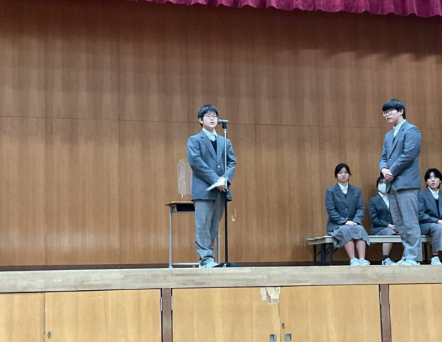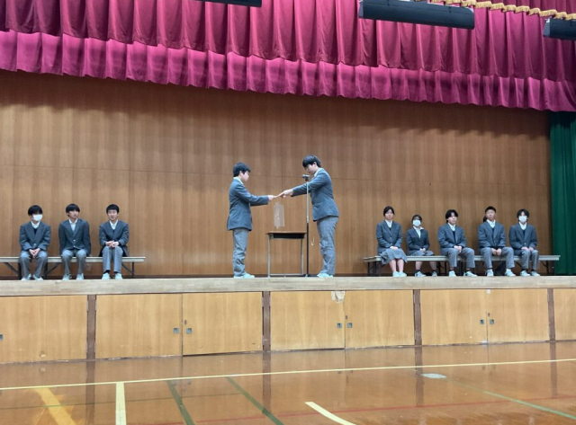 写真は環境委員の代表生徒が認証書を受け取り、決意表明をしている様子です。
