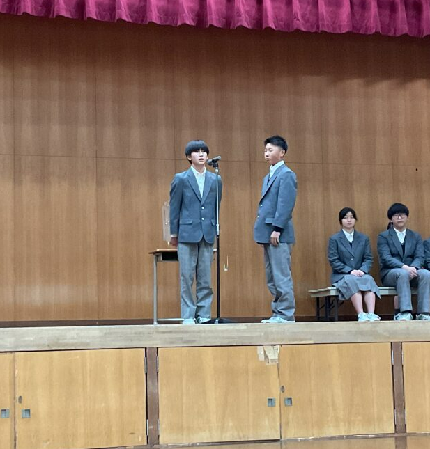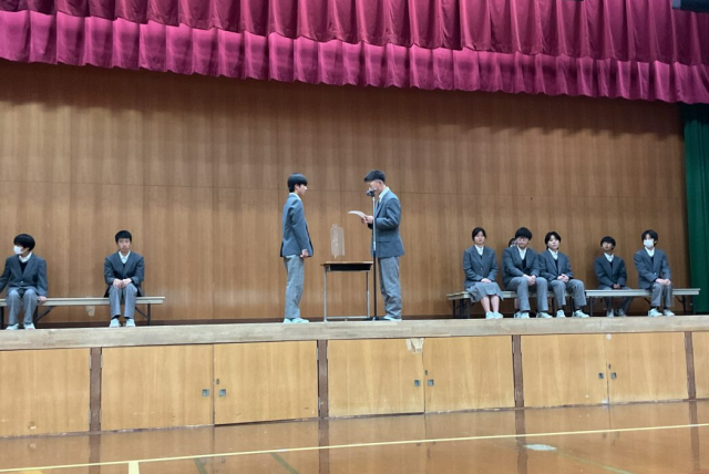 写真は体育委員の代表生徒が認証書を受け取り、決意表明をしている様子です。