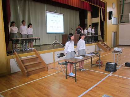 体育館では,明日5,6限の生徒総会に向けた会場設営とリハーサルを生徒会本部役員と学級委員長が行いました。