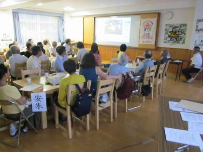 3小学区と中学校からの集まりで,今回は4校それぞれの児童・生徒の活動の様子を写真を交えて報告しあい,交流しました。(午後6時半〜,いきいき交流ルーム)