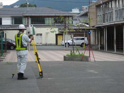 来年以降に実施される本校体育館の建て替えにむけて,本校を含めた広い範囲で測量が行われています。「一団地測量」というそうです。本日は,初めて学校の敷地内で測量が行われました。