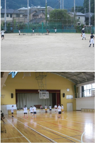 グラウンドでは野球部,体育館では女子バスケットボール部が練習中。