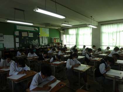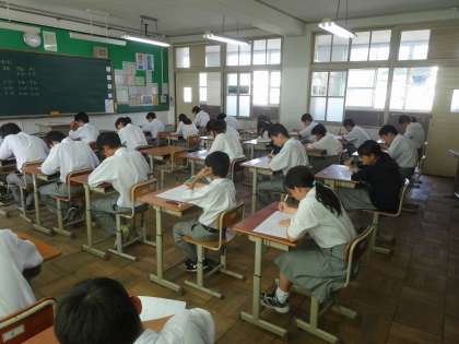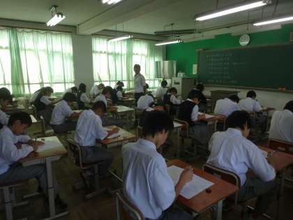 定期テスト2が始まりました。生徒たちは真剣な表情で問題に取り組んでいます。