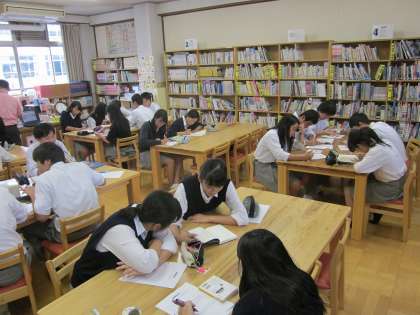 初めの10分で図書館の本から一冊を選び,その魅力を語るための準備を進めています。発表はまた別の時間に。