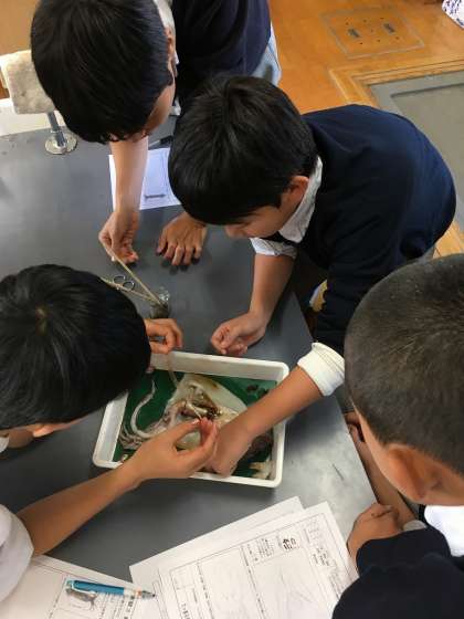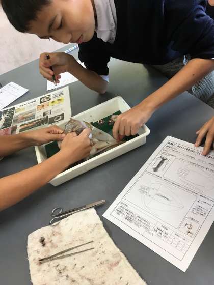 無脊椎動物を代表するものとして,軟体動物に分類されるイカの解剖をしました。脊椎動物とも多くの共通点があり,生徒たちも生物の体の仕組みについての関心が高まりました。