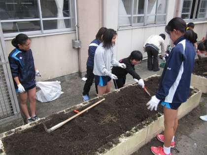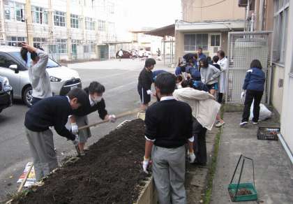 中庭南側の花壇を整える作業を行いました。1年生がチューリップの球根を植えるための準備です。