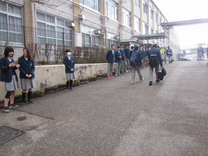 教員は通学路に立ち,校門は生徒たち。今日は生徒会本部と学級委員長です。