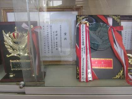 11月11日に開催された全市ビブリオバトル大会で本校1年生が獲得したグランドチャンプの盾が本館2階,図書館そばのガラスケースに収められました。本年11月に次回のビブリオバトルが開催されるまではここに保管されます。左に見えるのは7月にマルチメディア研究部が獲得した盾です。