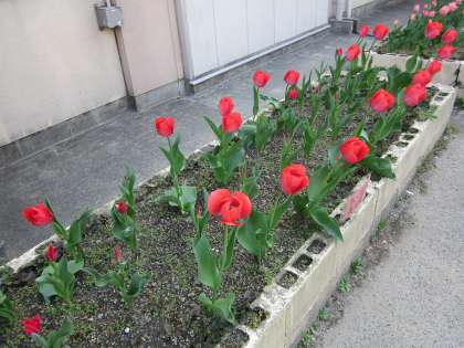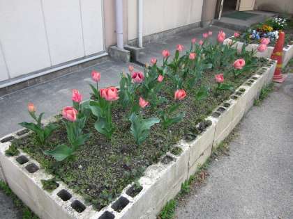 現2年生が1年生の時に球根を植えたチューリップが元気です。もう盛りを過ぎた花もありますが・・・