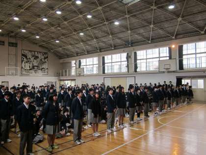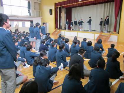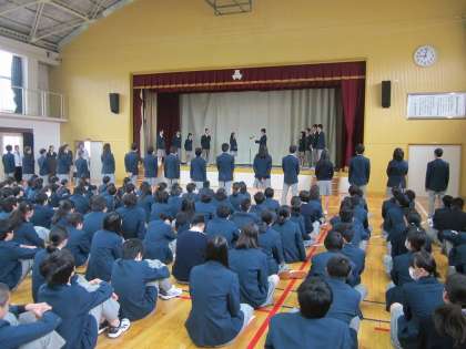 学級委員長,生活委員,美化保健委員,体育委員,文化図書委員の認証です。3年1組の委員が代表として各委員長から認証状を授与されました。